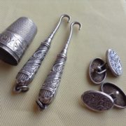 For vintage dining, this set is perfect. Six knives and six forks in a fancy design with impressed decoration on the knives. These are very useable and need a second lease on life.