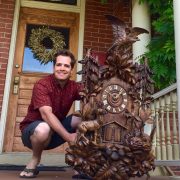 This is a magnificent antique Black Forest cuckoo clock. This example has it all. Huge size, measuring 63″, over 5 feet. The motif is has animals in full relief, all of them are alive. This is called a Romantic motif vs a Hunter motif where the animals are trophy mounts. A Romaric motif in this large size is very rare. The clock also have a 8 day fusee key wind movement. No weights or chains. Magnificent hands and numerals carved from bone. We can crate and ship worldwide, in person delivery and set up available in continental USA. Price on request.